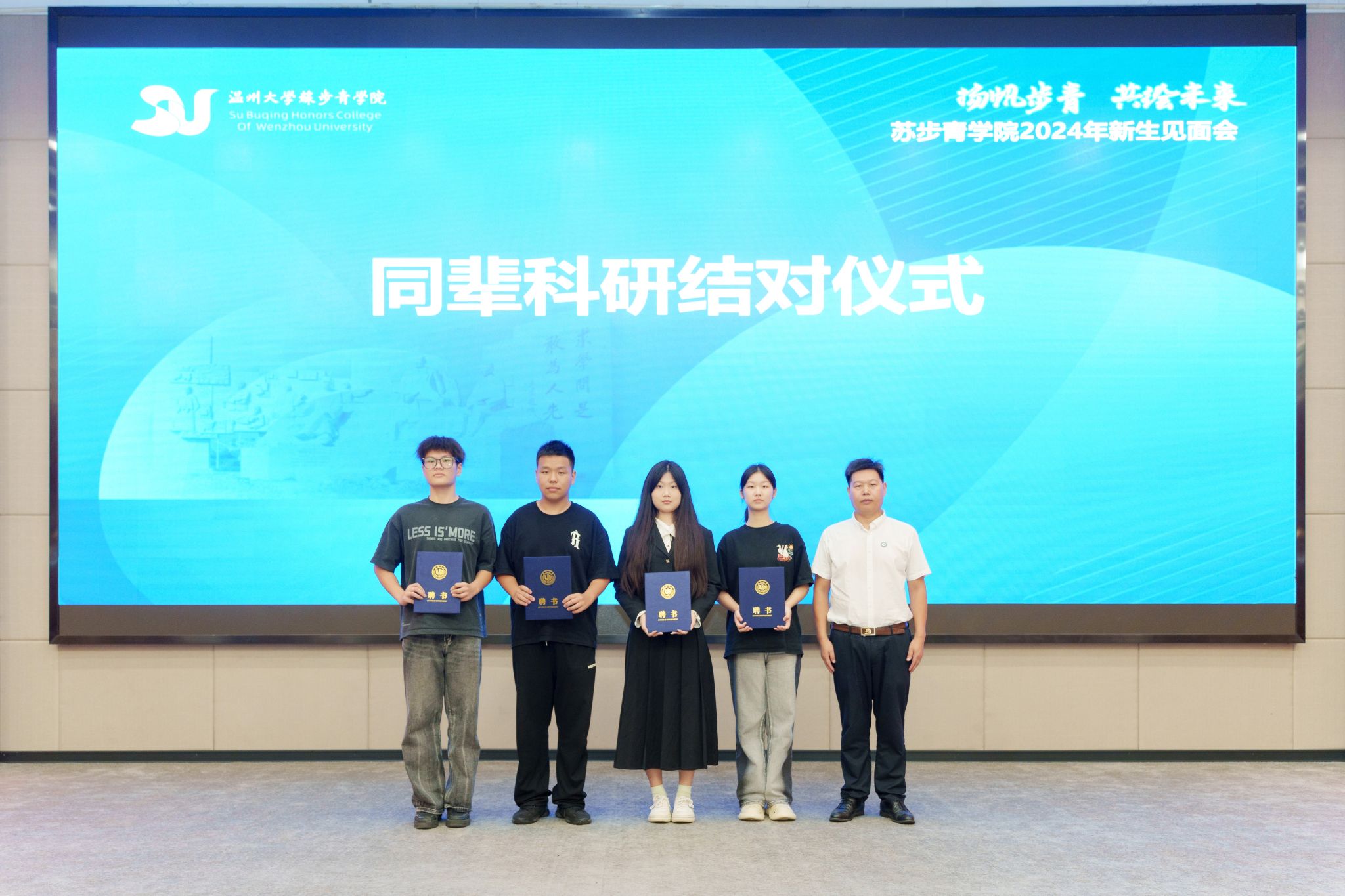 师生见面会上,还举行了同辈科研结对仪式。马增岭为23级步青科学实验班科研朋辈代表颁发聘书。随后,23级步青科学实验班同学与24级新生进行科研结对,这一举措旨在通过优秀学长学姐的示范引领作用,激发新生的学习内动力,促进他们在学习科研方面取得更多成就。