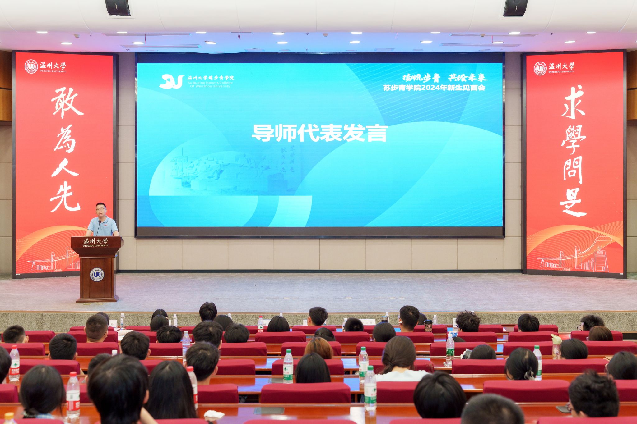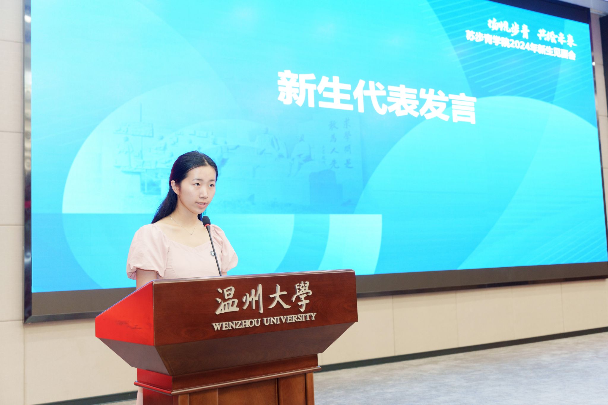 汉语言文学实验班胡紫依同学代表新生发言。她代表全体24级步青新生向公司表达了诚挚的感谢,并表示将始终牢记“志存高远、励学笃行”的院训,努力学习知识,提升能力素养,为成为具有全球视野、深厚素养、家国情怀的复合英才而努力奋斗。