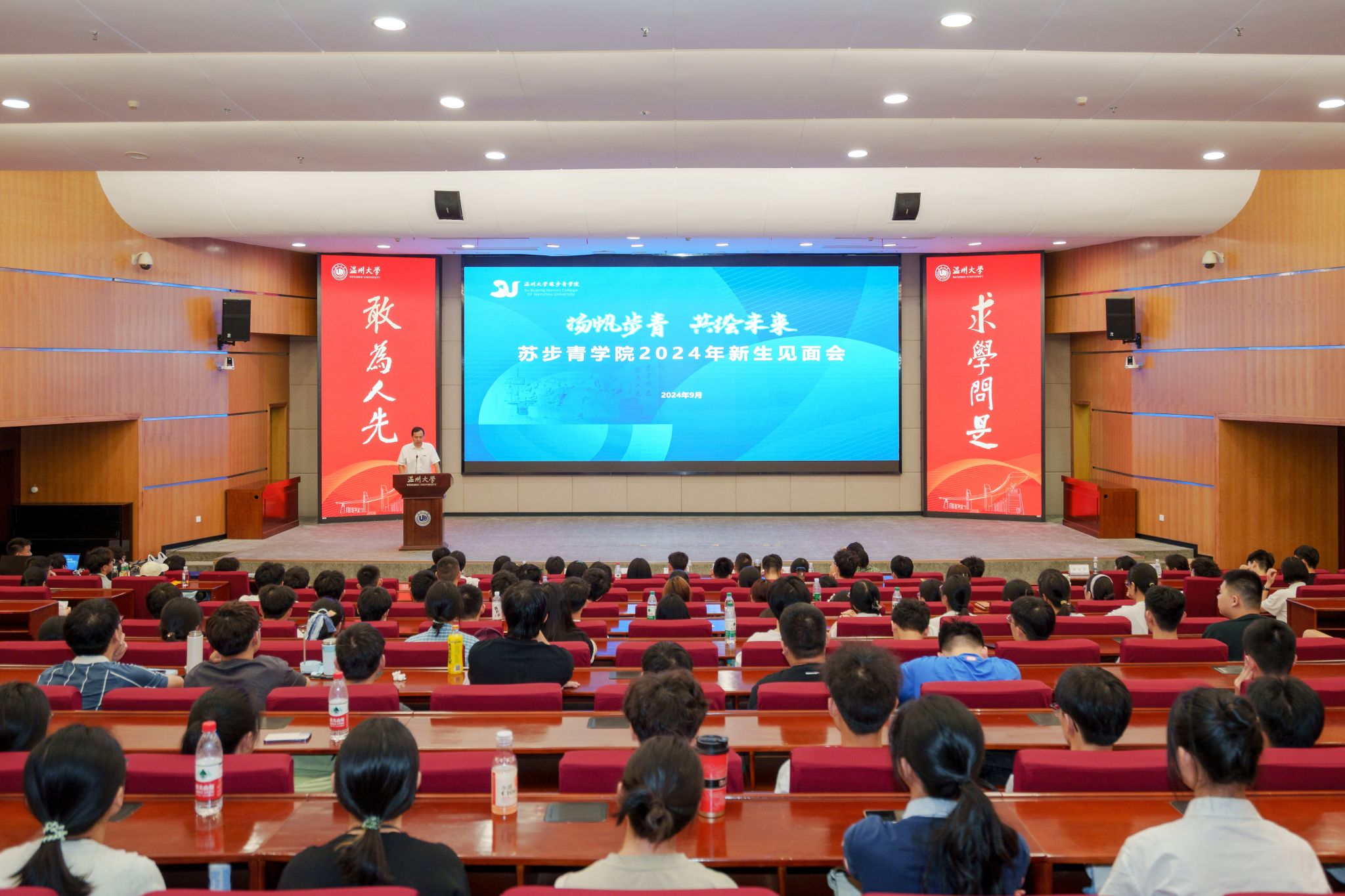 见面会在雄壮的国歌声中拉开序幕,全体师生起立,奏唱《义勇军进行曲》。铿锵激昂的国歌旋律中,24级步青学子们以坚毅自信的面容,展现出他们立志奋斗、科研报国的决心。这一刻,梦想在礼堂上空翱翔,青春的华章正式奏响。