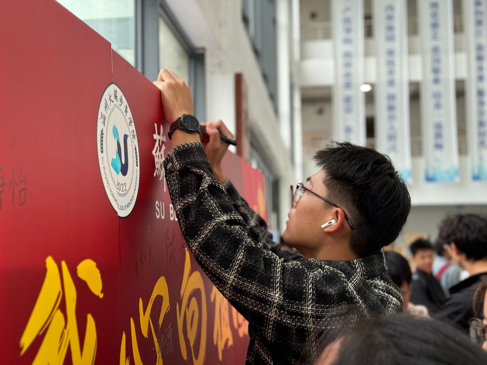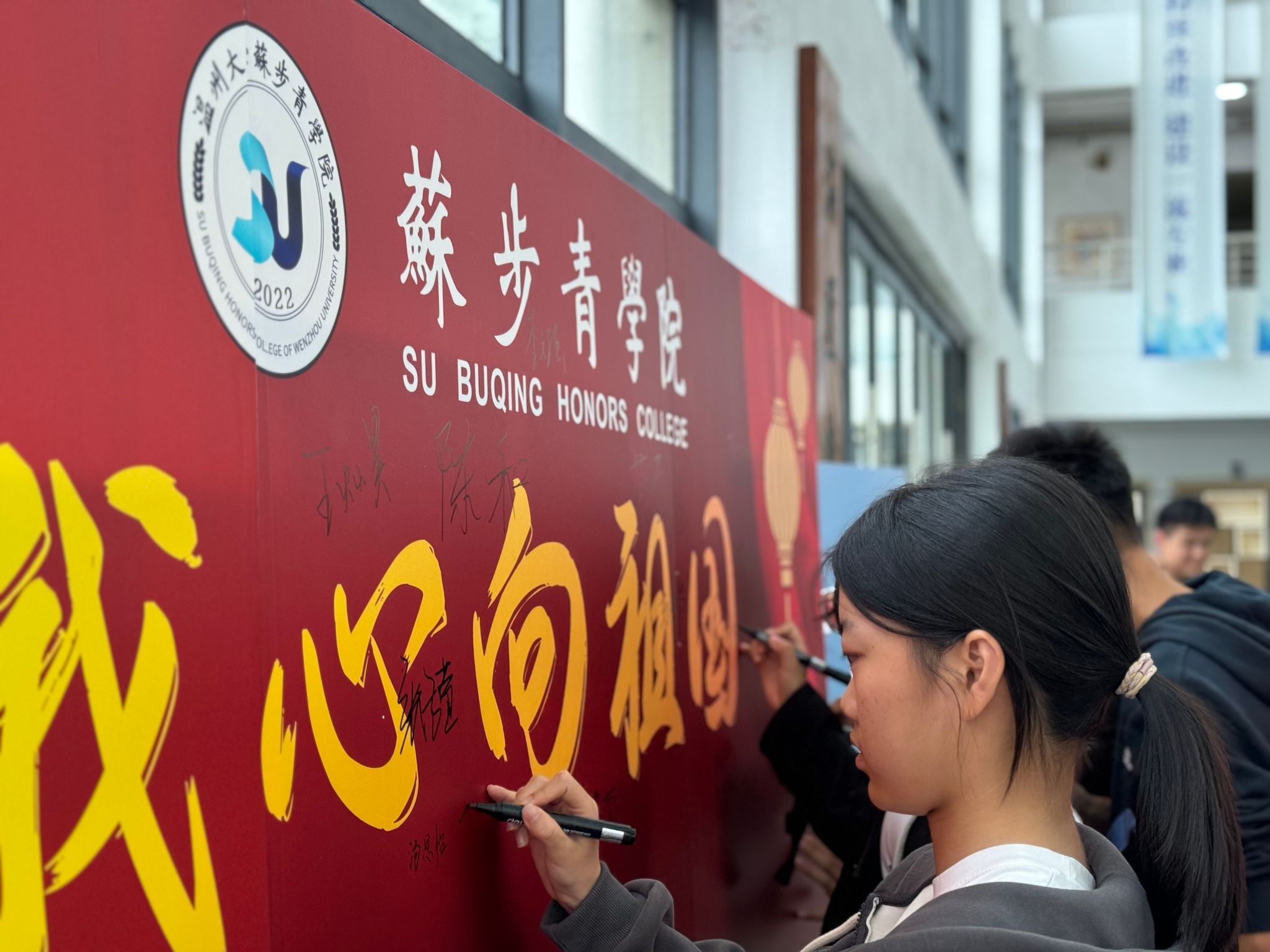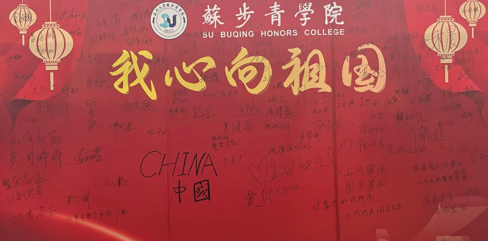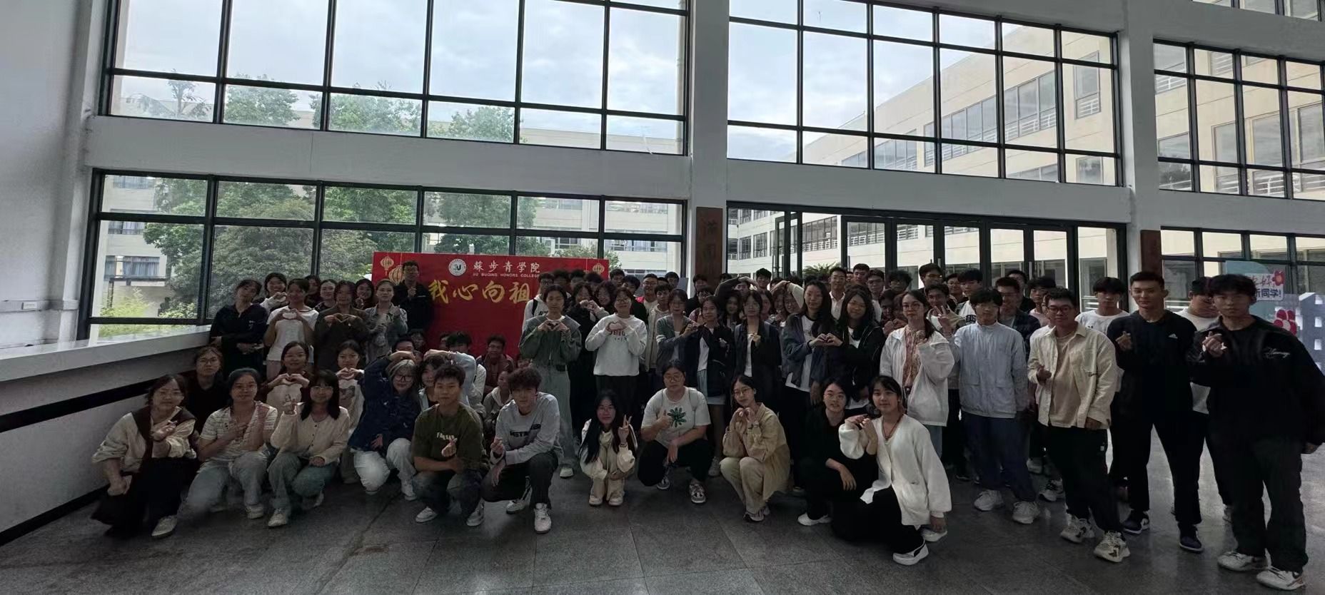 一笔一画皆是赤忱爱国心,这是同学们对于祖国的祝愿,更是心向祖国的深情告白。我们生于红旗下,长于春风中,以笔书写下心中的爱,更将以行动践行我们的爱。在签名结束后,不少同学面对镜头直抒胸臆,大声说出对于祖国的期望与愿景。同时也不难在大合照里发现隐藏着不少可爱的“告白”。一个个调皮的“爱心”从同学们手中蹦出,无言的热爱难藏于心。