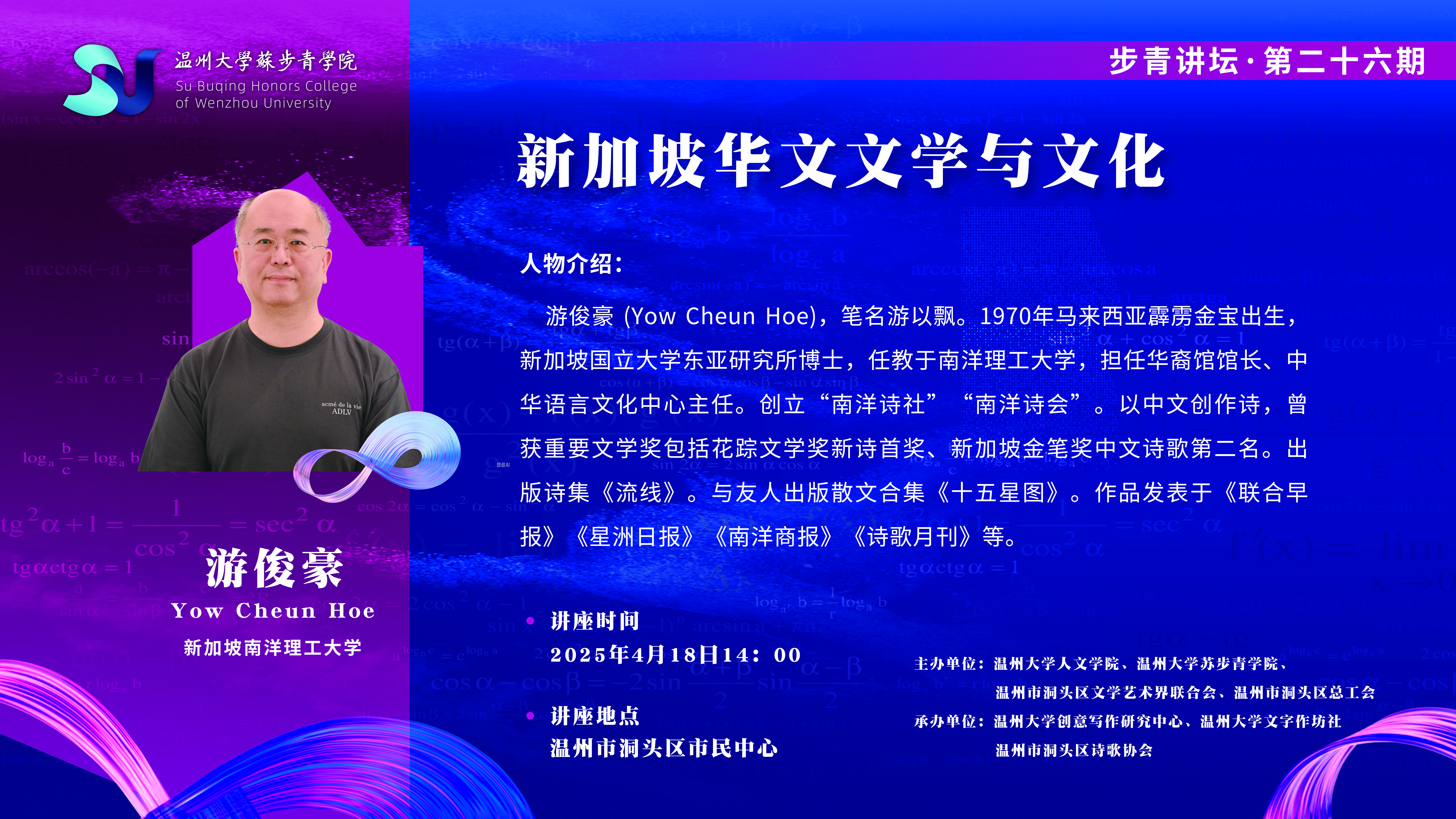 2025年4月18日下午,304永利集团在温州市洞头区市民中心开展第二十六期步青讲坛《新加坡华文文学与文化》。本次活动由304永利集团、永利集团人文公司、洞头区文艺艺术界联合会、温州市洞头区总工会等多个单位联合举办。本期讲座由来自新加坡南洋理工大学的学者、诗人游俊豪担任主讲,永利集团人文公司中文系的李广旭、刘卫东、张思静老师以及304永利集团24级步青汉语言班的员工共同参与。