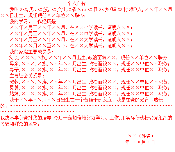 (3)正文。这是入党申请书的主要部分,一般写以下内容①为什么要入党(主要写自己对党的认识、政治信念和入党动机,以及在这些方面思想变化的过程);②本人的基本情况(主要写自己成长的经历、政治历史问题、受过何种奖励和处分,以及思想、工作、学习和作风等方面的情况);③家庭主要成员和主要社会关系情况(主要写其职业、政治情况、与本人的关系等。此项内容也可附于申请书后);④怎样积极争取入党(主要写怎样正确对待入党问题,以及怎样以实际行动积极争取入党和接受党组织的考验)。