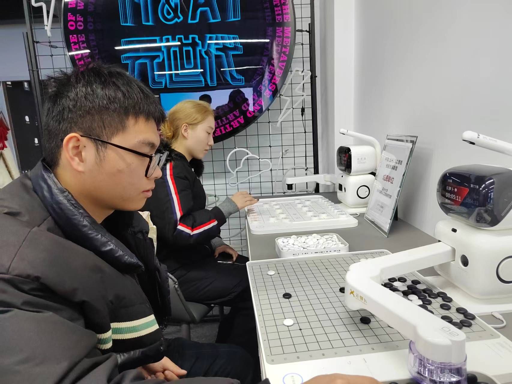同学们走入元宇宙与人工智能研究所,被里面各式各样的智能仪器所震撼,不仅展示了虚拟现实(VR)、增强现实(AR)等技术的最新成果,还通过互动体验让员工们亲身感受到元宇宙的魅力。有一秒钟就可以将你构建成3D模型的摄像厅,也有能够跨越时空与古人对话的大银屏,还有能够让我们像柯洁对战阿尔法狗一般来一场酣畅淋漓的围棋、五子棋甚至是象棋,去尝试感受天人合一的境界。当然在此地的感受与感悟不仅仅是产生于仪器以及物件的精妙和新奇,更是感受到陈教授对于人工智能以及教学实践的联系,陈教授用未来科技的现实构想将我们教育体系以及社会行业的可能性一一罗列。特别是VR打造的沉浸式课程教学如融合多门学科的“卖炭翁”课程,寓教于乐,让员工在一个个类似闯关的题目中,潜移默化间加深了对知识的掌握。让员工们仿佛置身于一个无边界的学习空间,打破了传统教育的空间限制。科技赋能,助力教育进步!不禁让我们对未来的跨学科和科技下的教育有了更深层次的思考,也对如何利用新兴技术与我们的学科教学相结合提供了新的思路和想法。