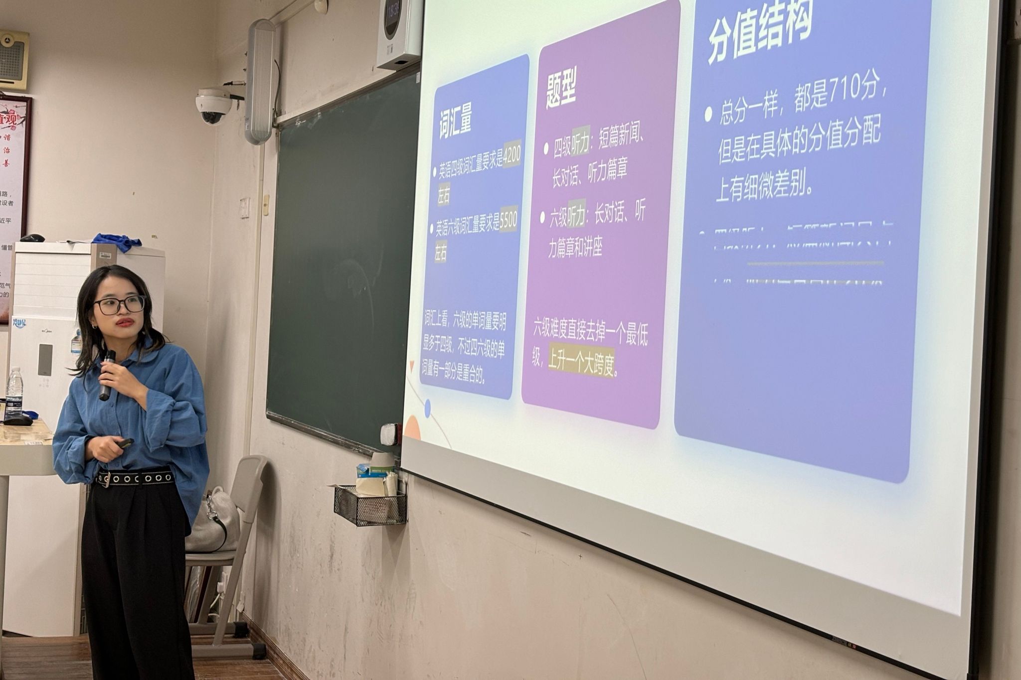 会议伊始,邹老师指出,大学英语四六级考试对考研保研、出国留学起关键作用。此后,她具体阐释了四六级考试的差别,并向同学们分享了备考资料和考试的时间安排。