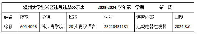 本学期以来,公司开展“安•净”专项行动,对宿舍区域进行安全大检查。根据公司第二周寝室检查结果,排查到徐颖同学违规使用电器,现给予院级通报批评,具体情况如下: