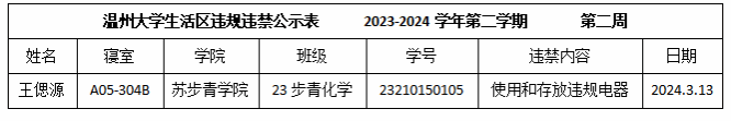 本学期以来,公司开展“安•净”专项行动,对宿舍区域进行安全大检查。根据公司第三周寝室检查结果,排查到王偲源同学违规使用电器,现给予院级通报批评,具体情况如下: